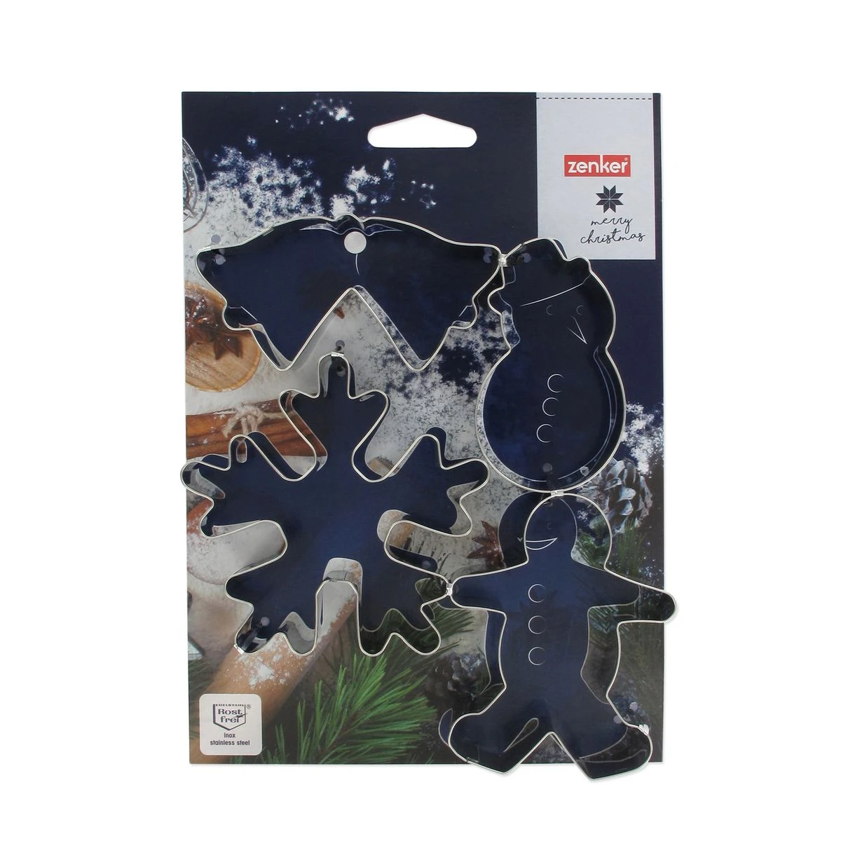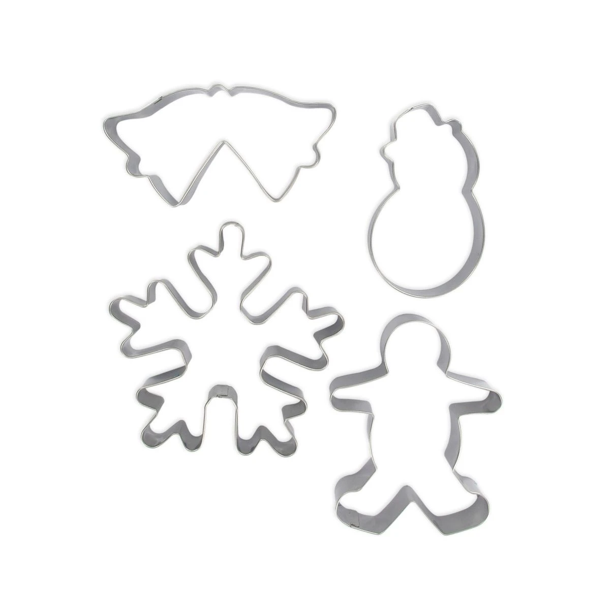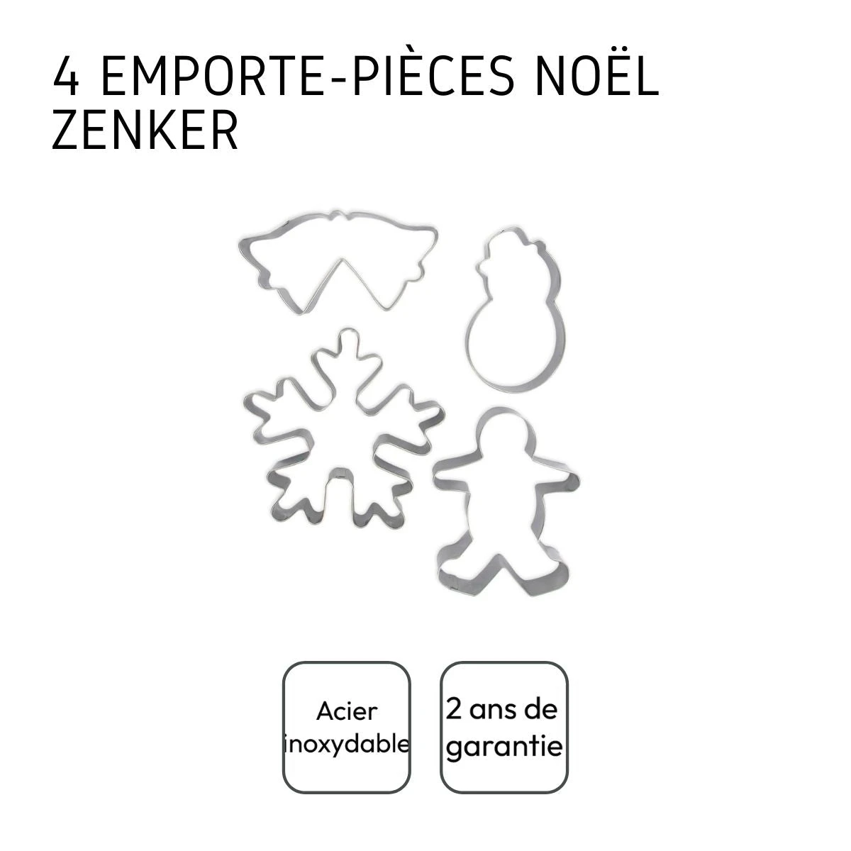DESCRIPTION : Set d’emporte-pièces de Noël composé de 4 éléments : un bonhomme de neige, une double cloche, un flocon de neige et un homme en pain d’épices LE PETIT + : Avec ce set d’emporte-pièces vous pourrez réaliser des biscuits de Noël, des sablés, des décorations en pâte à sucre COMPOSITION : Acier inoxydable DIMENSIONS : Homme en pain d’épices : 7 x 9 cm ; Flocon de neige : 10 x 9,5 cm ; Double cloche : 9,5 x 5 cm ; Bonhomme de neige : 4,5 x 8 cm CONTENU : 4 emporte-pièces de Noël Noël est une fête importante car toute la famille est rassemblée pour célébrer et partager de bons moments. Pour vous aider à passer de bonnes fêtes, Zenker vous propose de réaliser des biscuits de Noël ou des sablés et pour cela vous pouvez utiliser ces emporte-pièces de Noël. Ce lot d’emporte-pièces comprend un bonhomme de neige, des cloches, un flocon de neige et un bonhomme en pain d’épices. À vous de les décorer ensuite.