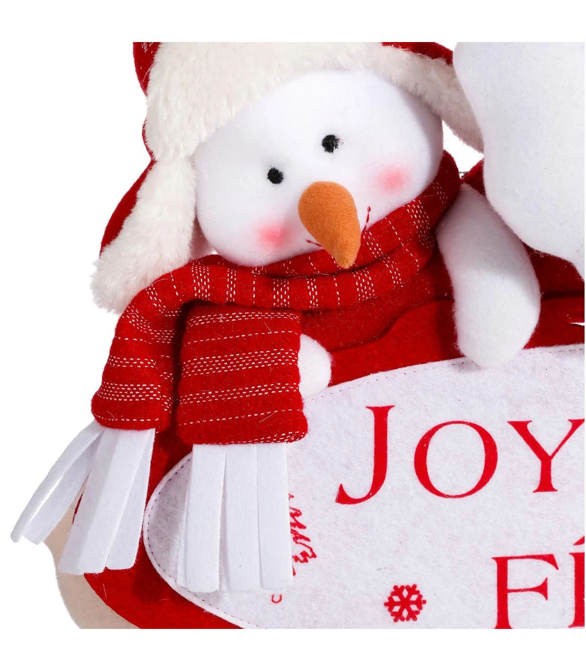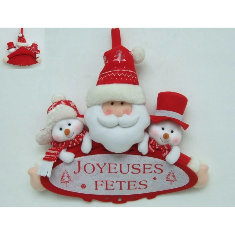 Pour une décoration de Noà«l originale et féérique. Pancarte en peluche à accrocher aux murs, aux portes intérieures €¦. – Pancarte composée de 3 peluches : têtes + bras + bonnet ou chapeau du père Noà«l et de 2 bonhommes de neige tenant une pancarte avec mention : ‘Joyeuses fêtes’. A accrocher gr ce au cordon gris ou rouge en feutre prévu à cet effet. Matière : 80% polyester,20% foam. Hauteur.50cm au total. Profondeur.10cm. Largeur.50cm. Couleur. Rouge et blanc. Poids.0.28 kg.