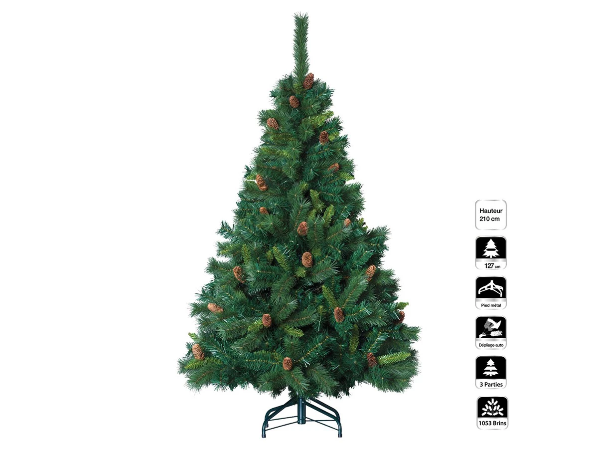 Sapin de Noël artificiel aiguille + pomme de pin. Hauteur : 210 cm. Diamètre : 135 cm. Matière : 50% PVC + 50% Métal. Couleur : Vert. Le pied en métal assure un maintient parfait du sapin.Caractéristiques techniquesCouleur : VertDécorations intégrées : OuiDécorations lumineuses : NonFlocage blanc : NonHauteur : 210 cmMarque : FÉÉRIC CHRISTMASMatière(s) : Métal & PVCPoids : 9,4 kgUtilisation : Intérieur